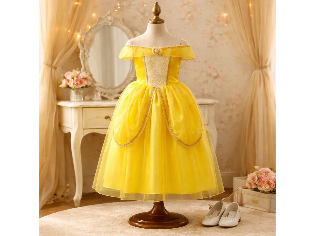 👑✨ Tento pohádkový kostým pro malé princezny okouzlí na první pohled svým jasným žlutým provedením a elegantním střihem. Šaty jsou navrženy tak, aby působily slavnostně a zároveň byly pohodlné pro dětské nošení při hrách, oslavách nebo karnevalu.