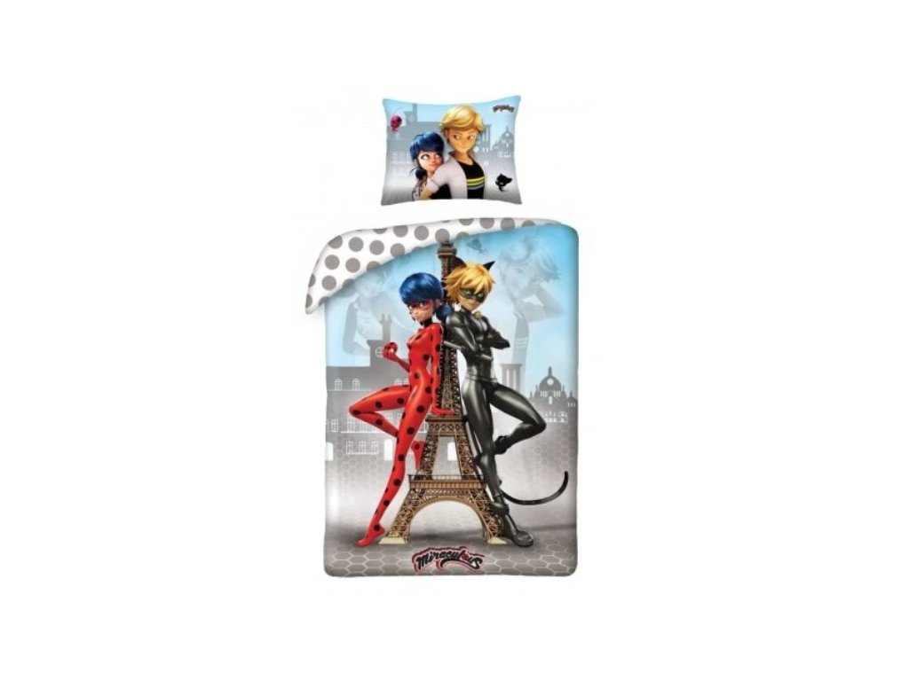 Kvalitní dětské ložní povlečení s oblíbenými hrdiny Kouzelná Beruška a Černý kocour z animovaného seriálu Miraculous potěší každé dítě. Povlečení je oboustranné – z jedné strany výrazný motiv postav, z druhé jemný puntíkový vzor, takže si děti mohou vzhled postele snadno obměnit.