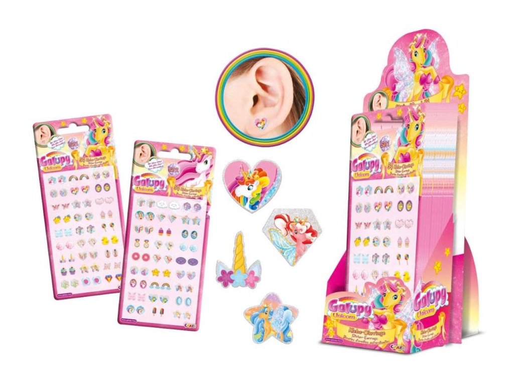 Tato bohatá sada obsahuje celkem 54 třpytivých nalepovacích náušnic s motivy jednorožců Galupy. Díky jednoduchému nalepení jsou ideální i pro děti bez propíchnutých uší, které si chtějí vyzkoušet různé styly.