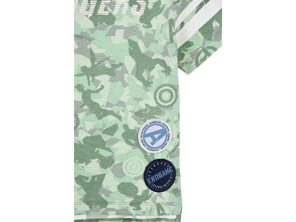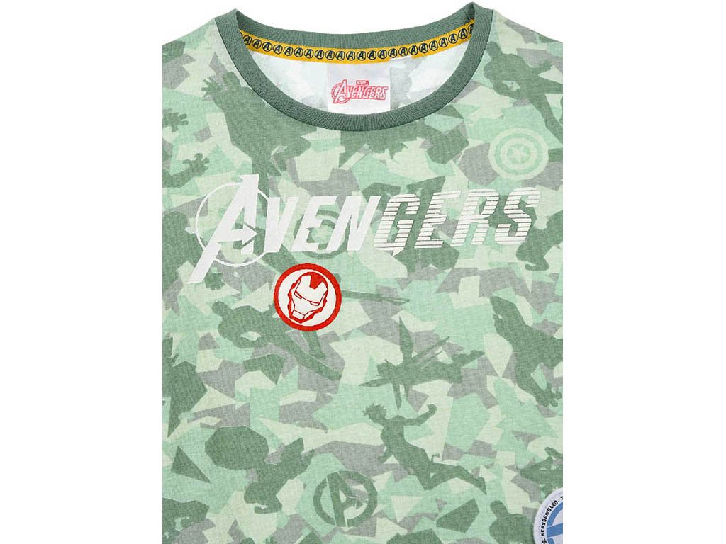 Tričko má zelený podklad s celoplošným tematickým potiskem v komiksovém stylu. Přední část doplňují vyšívané znaky (nášivky) jednotlivých Avengers, které působí kvalitněji než běžný potisk a zvyšují celkovou odolnost i atraktivitu trička.