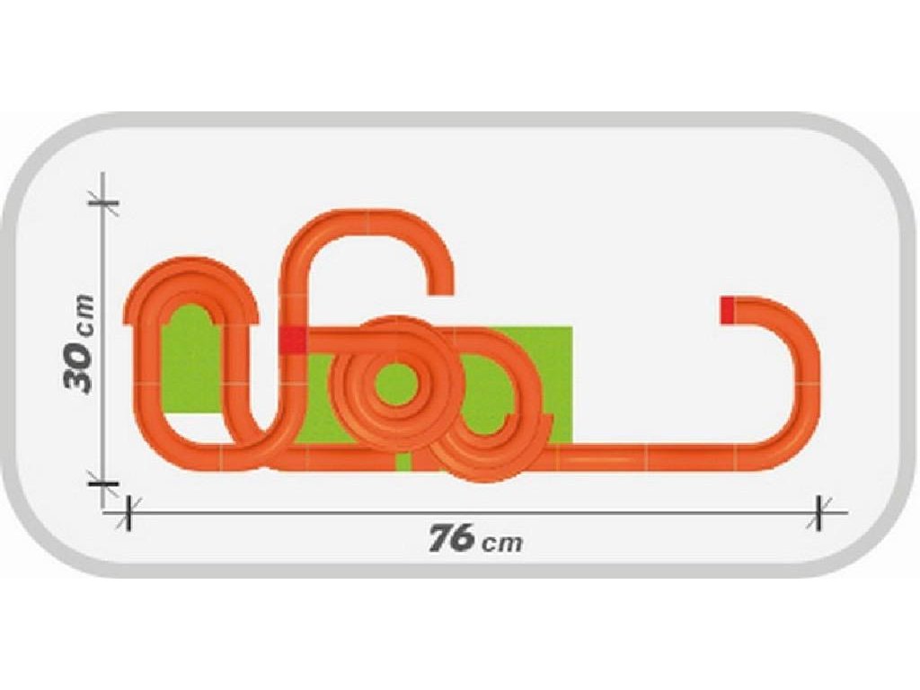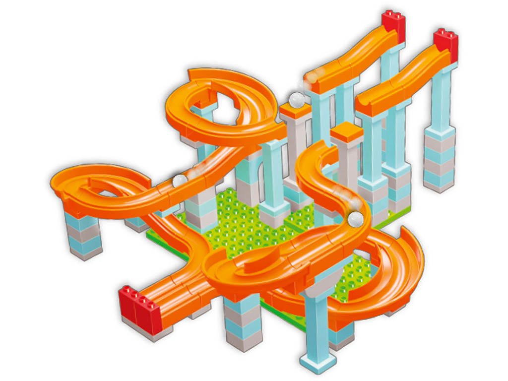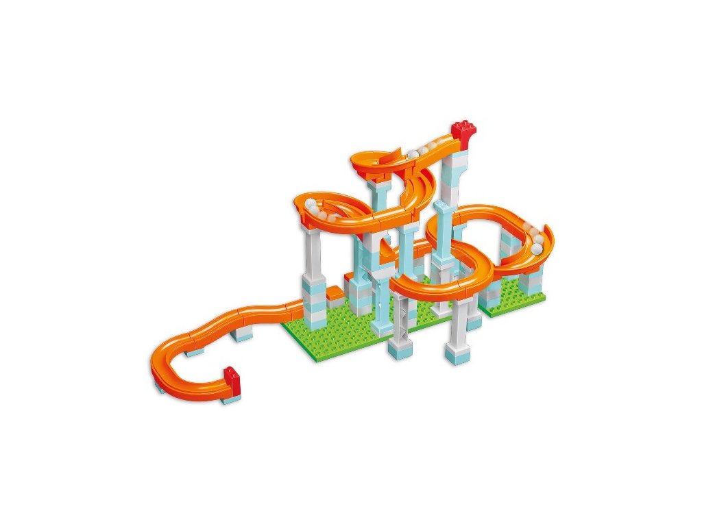 Balení obsahuje 128 dílků z větších plastových kostiček a 3 kuličky. Díly se snadno spojují, dobře drží a umožňují opakované přestavování dráhy. Hotové varianty mají rozměry cca 76 × 39 × 30 cm nebo 54 × 53 × 25 cm.