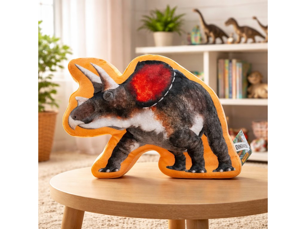 Hebký, tvarovaný polštář v designu dinosaura - Triceratopse. Včetně výplně, rozměry cca. 36x27cm.