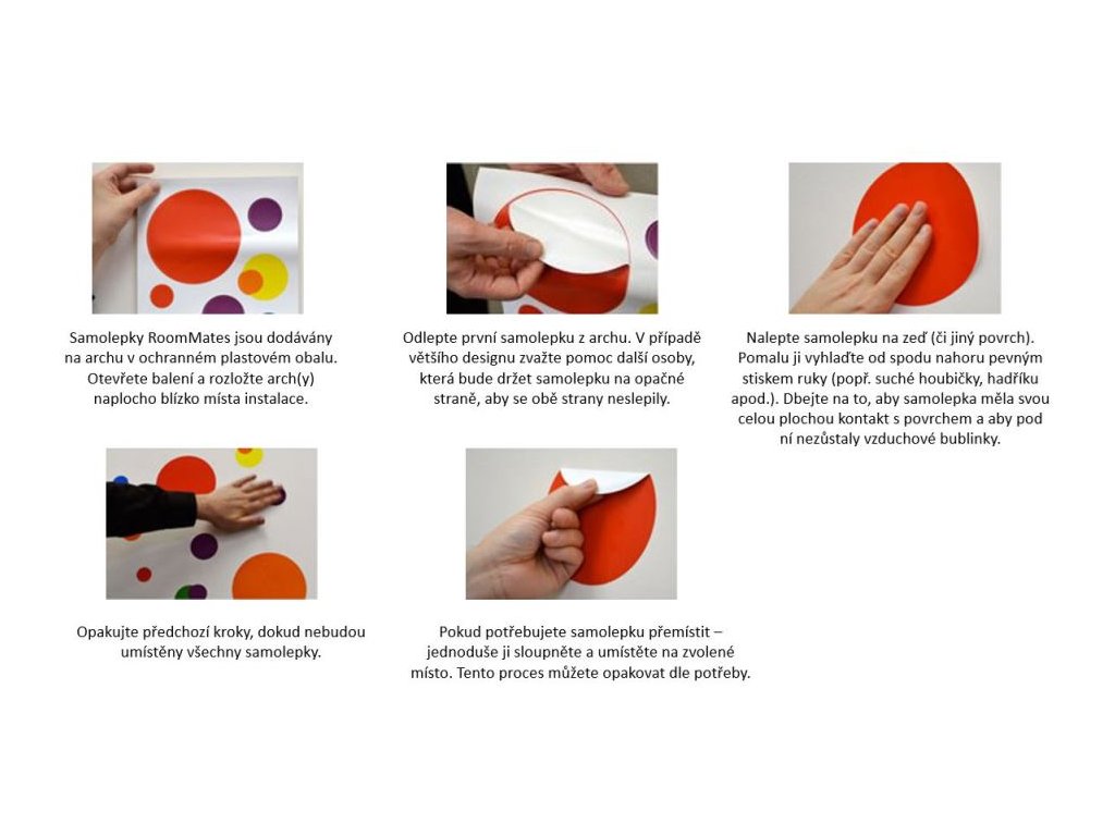 Samolepky a samolepící dekorace RoomMates jsou velmi jednoduše umístitelné a díky speciálnímu adhesivu libovlně přemístitelné - při sloupnutí nezanechávají žádné "lepivé" stopy, ani nepoškozjí povrch, na kterém jsou umístěny. Instalace je vlemi jednoduchá - zvládne ji hravě každý! Lze je umístit v podstatě na jakýkoli hladký povrch, včetně prostor se zvýšeným výskytem vlhkosti (např. koupelny). Samolepky lze omýt vlhkým hadříkem.