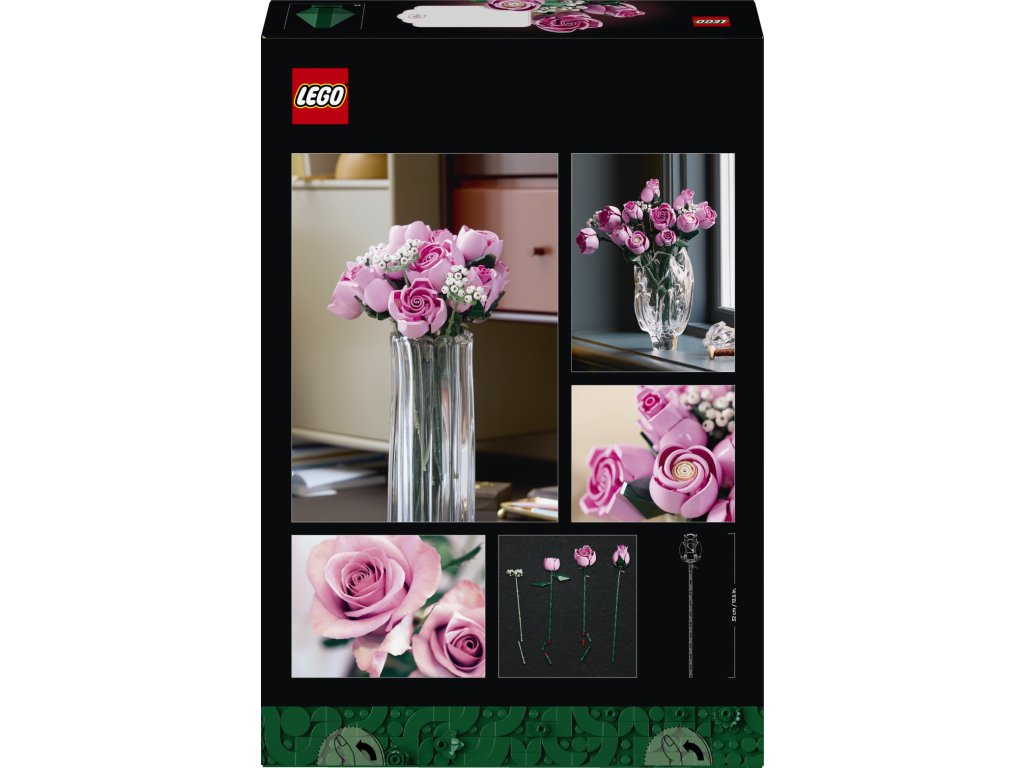 Stavebnice LEGO Botanicals Kytice růžových růží umožňuje vytvořit jemnou a detailní květinovou dekoraci z 12 růží v různých fázích rozkvětu. Kombinace plně rozkvetlých květů, poupat a doplňkových bílých kvítků nevěstina závoje dodává kytici přirozený a elegantní vzhled.