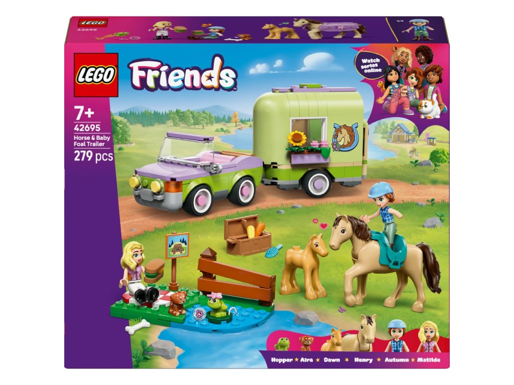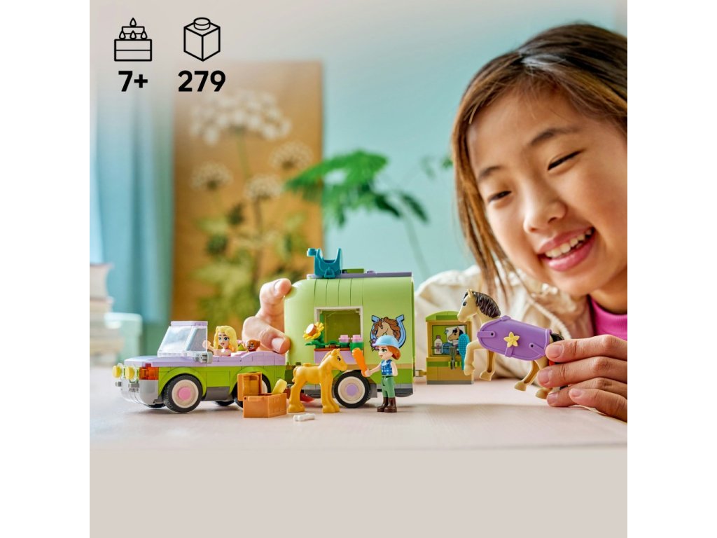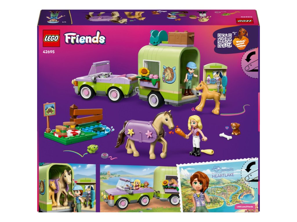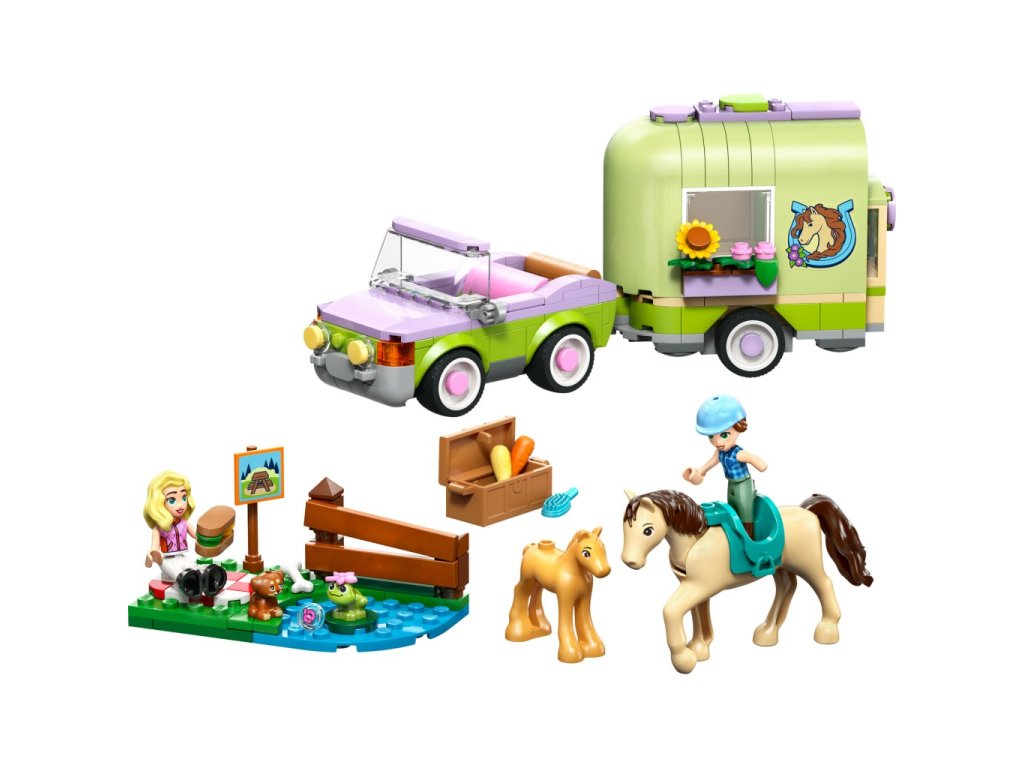 Stavebnice LEGO Friends Přívěs s koněm a hříbětem zavede děti do světa venkova, kde se mohou starat o koně, hříbě i další zvířátka. Součástí je otevírací přívěs na přepravu koní v jemných zeleno-fialových barvách, který lze snadno připojit k autu.