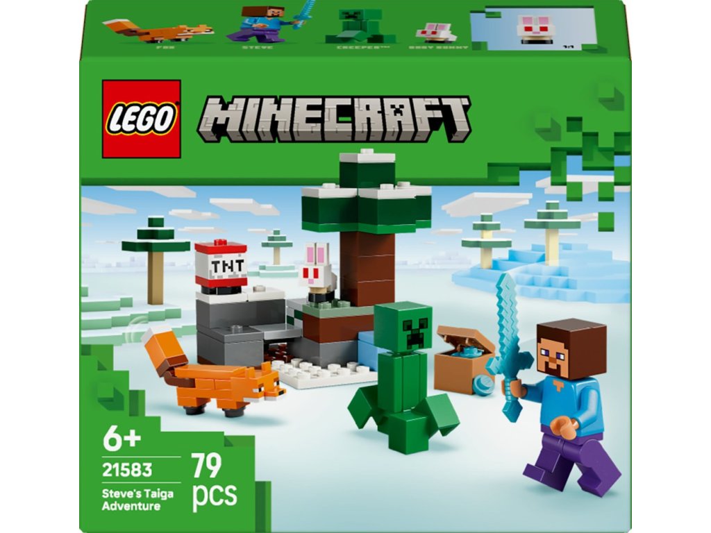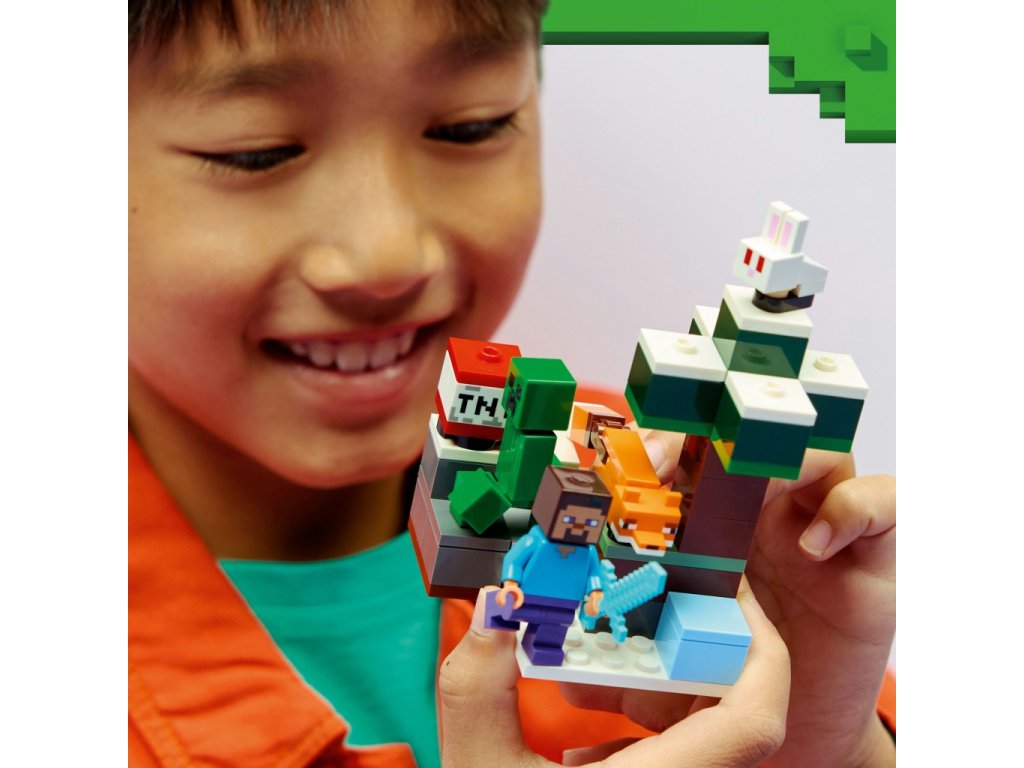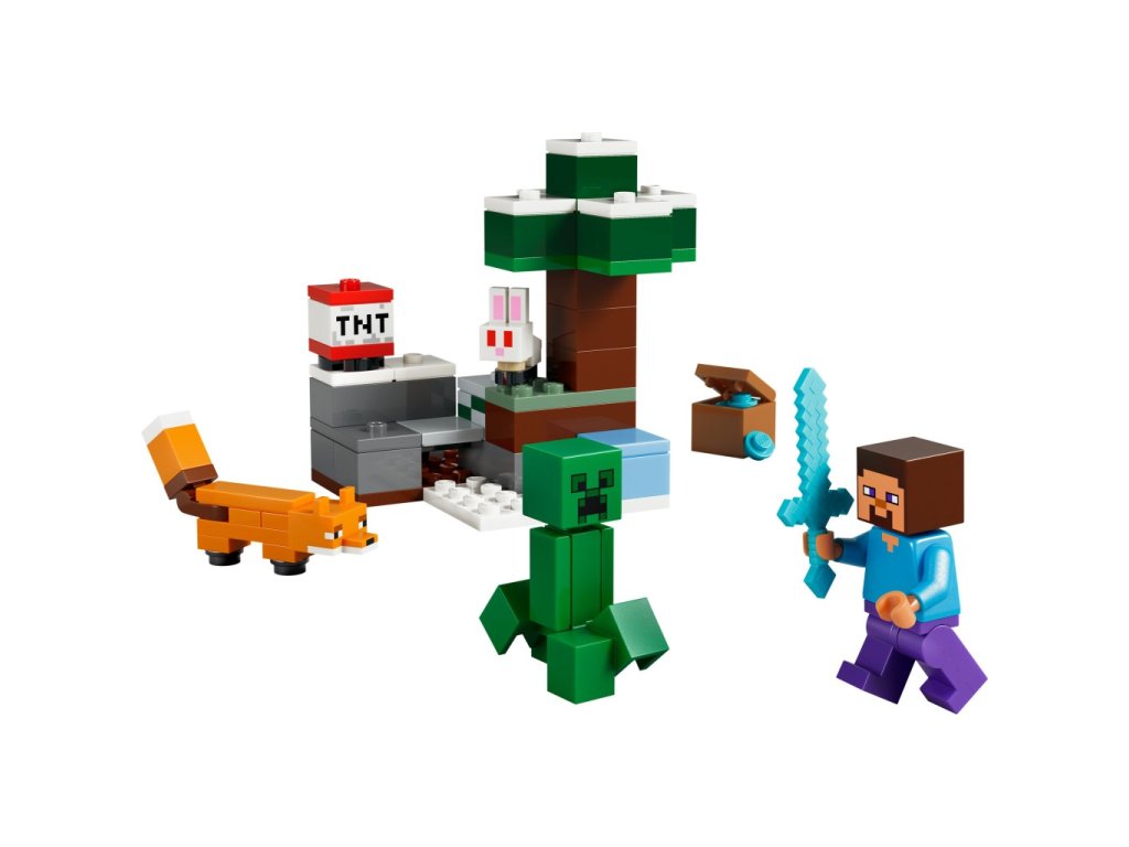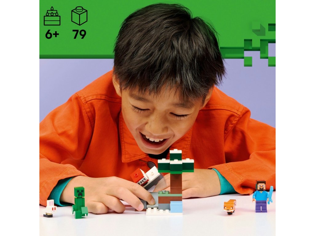 Stavebnice LEGO® Minecraft® Steve a dobrodružství v tajze umožní dětem prožít napínavou výpravu v zasněženém biomu. Steve těží diamanty, čelí nebezpečnému Creeperovi a objevuje tajgy plné zvířat a skrytých překvapení.
