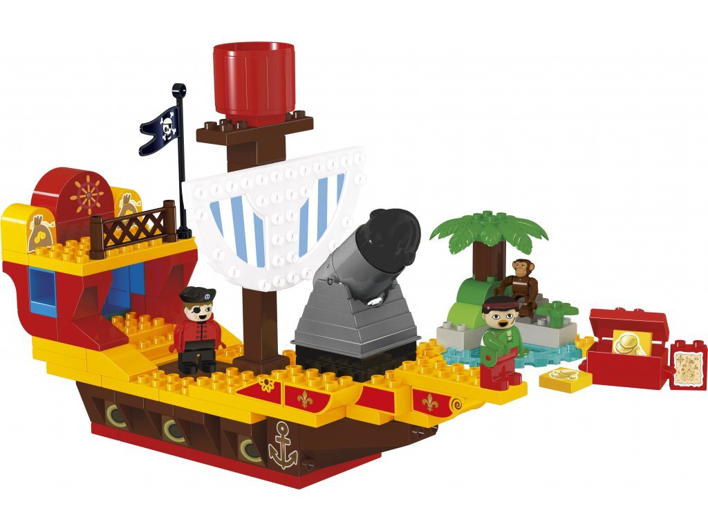 Balení obsahuje 100 dílků z větších plastových kostiček a 3 figurky – dva piráty a opičku. Díly se snadno skládají, dobře drží a jsou přizpůsobené menším dětským rukám. Loď lze po sestavení dále přestavovat a kombinovat s dalšími stavebnicemi tohoto typu.